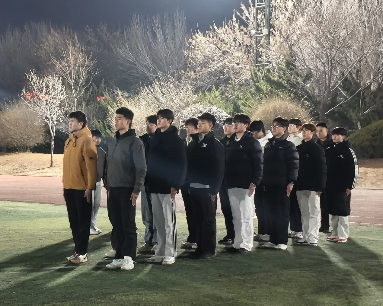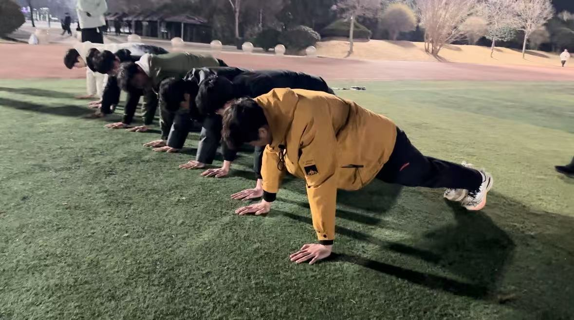 晚八时许,百余名成员迅速集结。随着一声哨响,全体如钢钉般挺立。下颌微收、五指并拢、肩背绷直,标准军姿的每一处细节都凝聚着对纪律的敬畏。夜色中,汗水顺着鬓角滑落,但无人晃动分毫。军姿练的是心性,站的是信仰!训练队长的话掷地有声。
