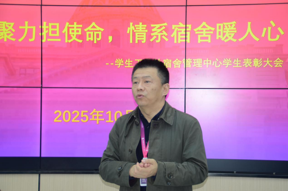 最后,阎磊作总结讲话。他强调,宿舍是学生在校生活的重要场所,宿舍管理直接关乎学生的生活质量与校园和谐稳定,希望全体学生以受表彰者为榜样,将“担当、奉献、协作”的精神融入日常行为,共同营造温暖、有序、和谐的宿舍环境。