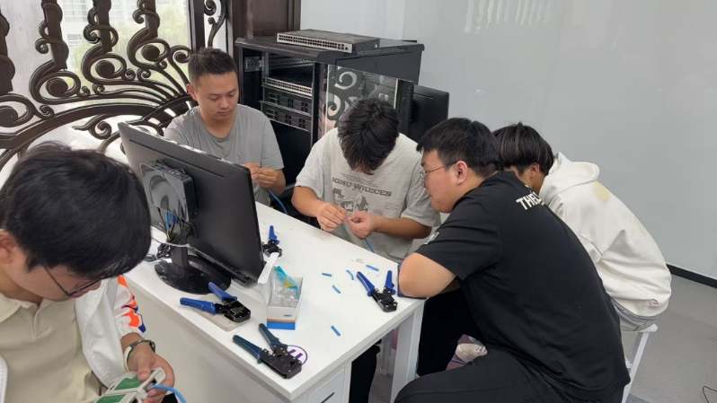 备赛现场,气氛紧张而有序。学生们分工协作,有的负责制作网线水晶头,手法娴熟、一丝不苟;有的则专注于将网线接入交换机和服务器,确保每一个端口都准确无误。桌面上散落着压线钳、测线仪等专业工具,以及被剪下的网线外皮,无不彰显着训练的强度与深度。指导教师在一旁悉心指导,及时解答学生们的疑问,确保每一个操作细节都符合行业规范和比赛要求。