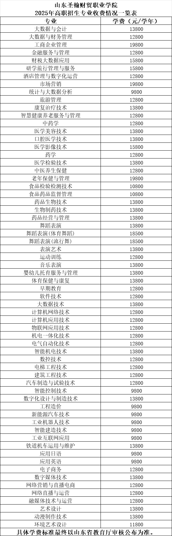山东圣翰财贸职业学院 2025年高职招生专业收费和