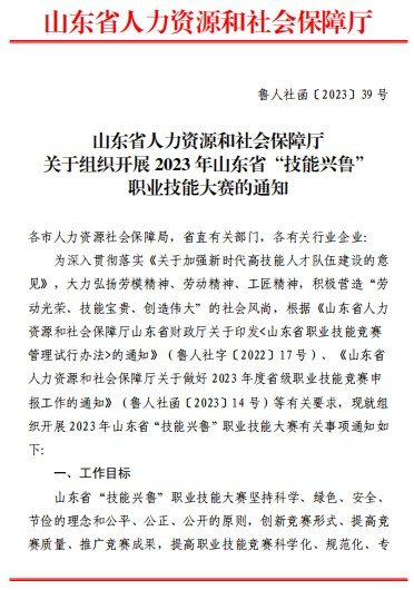 山东省人力资源和社会保障厅关于组织开展2023 年山东省“技能兴鲁职业技能大赛的通知