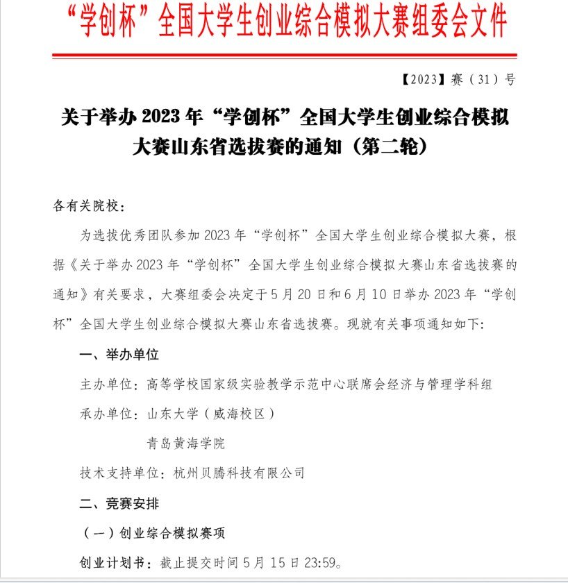 关于举办2023年“学创杯”全国大学生创业综合模拟大赛山东省选拔赛通知