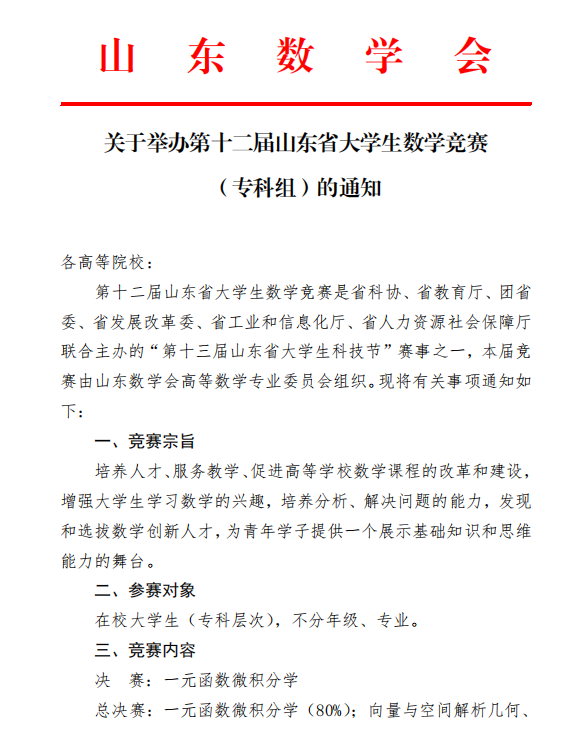 关于举办第十二届山东省大学生数学竞赛 (专科组)的通知