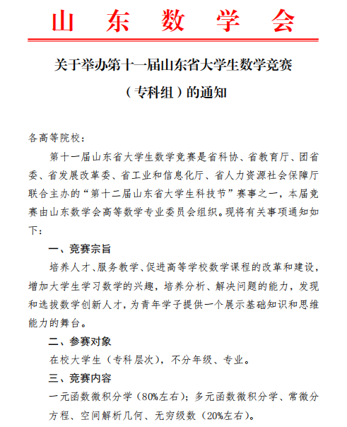 关于举办第十一届山东省大学生数学竞赛 (专科组)的通知