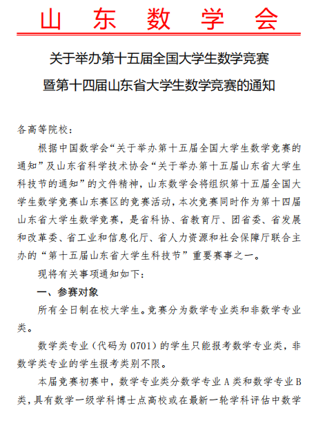 关于举办第十五届全国大学生数学竞赛 暨第十四届山东省大学生数学竞赛的通知