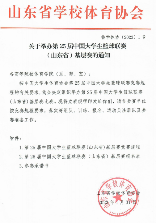 关于举办第25届中国大学生篮球联赛(山东省)基层赛的通知