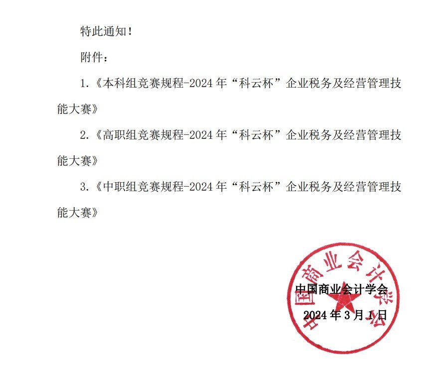 为深入贯彻党的二十大精神,落实坚持教育优先发展、科技自立自强、人才引领驱动,加快建设教育强国、科技强国、人才强国,坚持为党育人、为国育才的宗旨。坚持“以赛促学、以赛促教、以赛促改、以赛促建”,充分发挥技能大赛对财会专业教育的“树旗、导航、定标、催化”作用,提高各院校财会人才培养质量。中国商业会计学会决定举办 2024 年“科云杯”企业税务及经营管理技能大赛。
