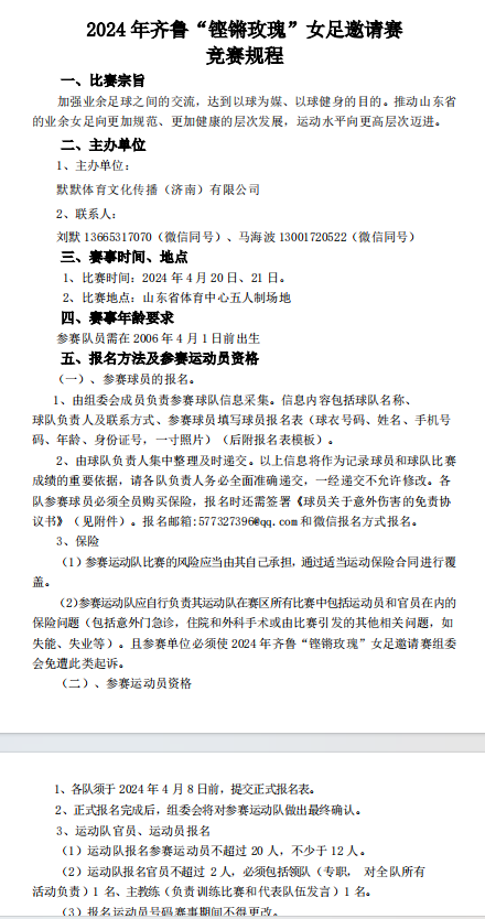 2024 年齐鲁“铿锵玫瑰”女足邀请赛 竞赛规程