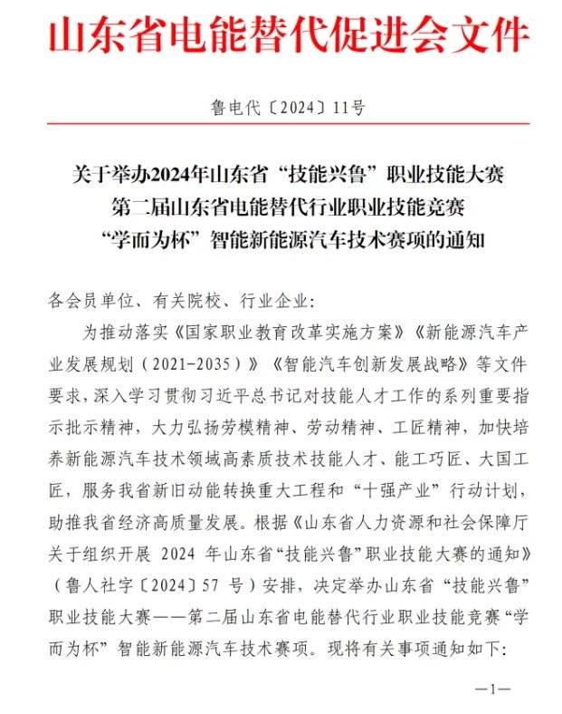 智能工学院收到关于举办2024年山东省“技能兴鲁”职业技能大赛—第二届山东省电能替代行业职业技能竞赛 “