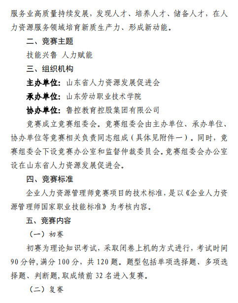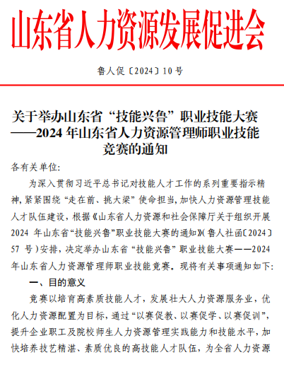 关于举办山东省“技能兴鲁”职业技能大赛 ——2024 年山东省人力资源管理师职业技能 竞赛的通知