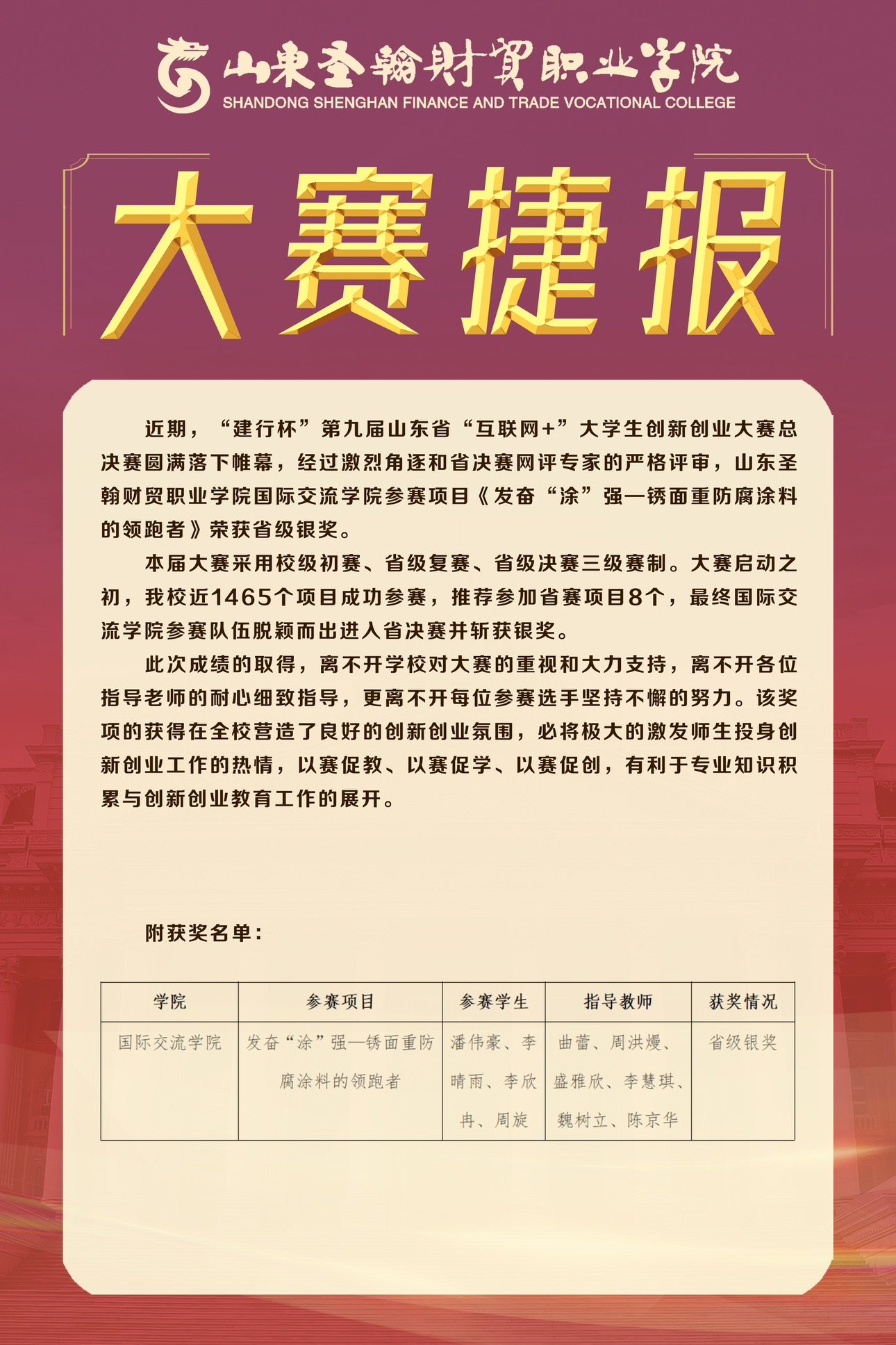 近期,“建行杯”第九届山东省“互联网+”大学生创新创业大赛总决赛圆满落下帷幕,经过激烈角逐和省决赛网评专家的严格评审,山东圣翰财贸职业学院国际交流学院参赛项目《发奋“涂”强一锈面重防腐涂料的领跑者》荣获省级银奖。