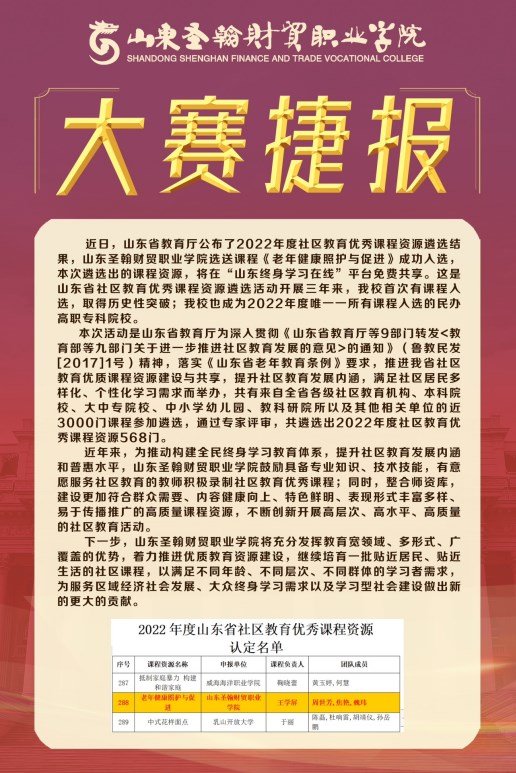 健康学院《老年健康照护与促进》课程入选山东省2022年度社区教育优秀课程资源