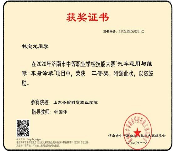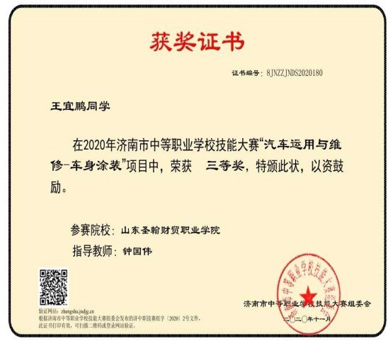 山东圣翰财贸职业学院作为唯一一支民办院校参赛的队伍,不畏强手,勇于迎战,由钟国伟老师指导的五年制高职学院2018级2班的王宜鹏同学在“车身喷涂”赛项中获得个人赛三等奖。