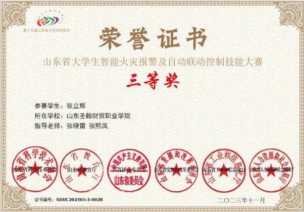 10月21日,第十五届山东省大学生科技节智能火灾报警及自动联动控制技能大赛圆满落下帷幕,山东圣翰财贸职业学院智能工学院参赛选手张立辉在智能工学院指导教师张晓雷、张熙凤的指导下,荣获省级三等奖,实现建筑消防技术专业的历史性突破。