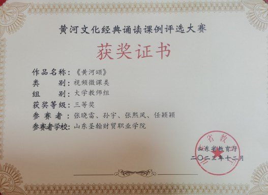 近日,山东省教育厅山东省语言文字工作委员会举办的黄河文化经典诵读课例大赛评选活动圆满落幕,经过激烈角逐,山东圣翰财贸职业学院智能工学院教师张晓雷、张熙凤、孙宇、任颖颖老师的参赛作品《黄河颂》获得大学教师组省级三等奖。