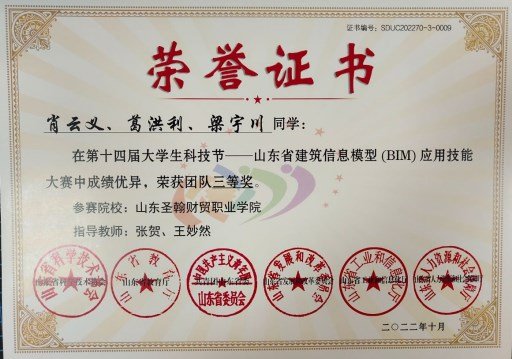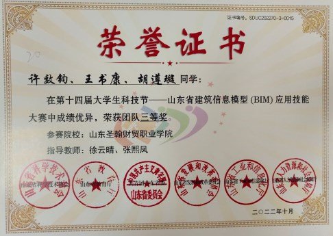 2022年9月24日,第十四届大学生科技节-山东省建筑信息模型(BIM)应用技能大赛圆满落下帷幕,山东圣翰财贸职业学院智能工学院参赛选手许效钧、王书康、胡遵璇、肖云义、葛洪利、梁宇川在智能工学院指导教师张熙凤、徐云晴、张贺、王妙然的指导下,荣获省级三等奖。