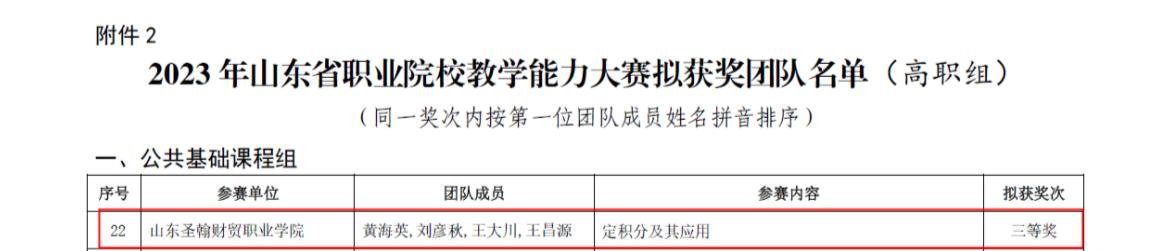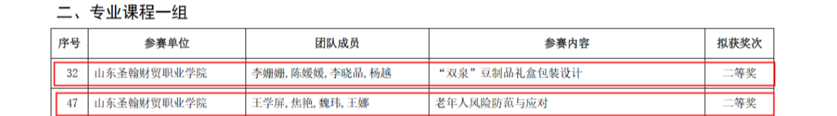 近日,2023年山东省职业院校教学能力大赛正式落下帷幕,山东圣翰财贸职业学院艺术学院包装设计与制作团队、健康学院老年健康照护团队、公共基础部高等数学团队三支队伍历经校级选拔、省级初赛、省级决赛,最终载誉而归,获二等奖2项,三等奖1项。