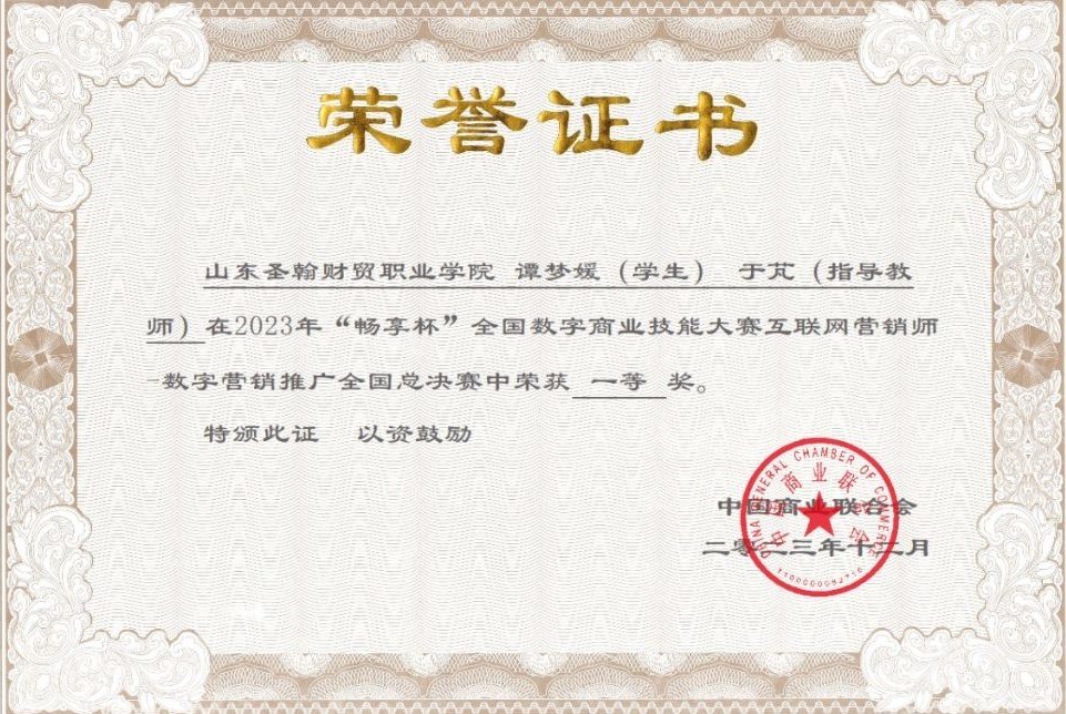 2023年12月,由中国商业联合会主办,中国商业联合会互联网应用工作委员会承办,中教畅享(北京)科技有限公司提供技术支持的2023年“畅享杯”全国数字商业技能大赛圆满落下帷幕。商学院学生参加了“企业数字化管理沙盘”、“互联网营销师数字营销推广”、“跨境电子商务进出口”三个赛项的比赛,获得一等奖3项,二等奖3项,三等奖7项。
