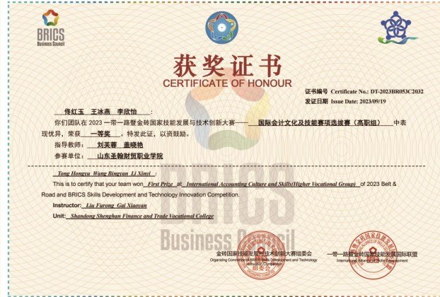 近日,2023“一带一路暨金砖国家技能发展及技术创新大赛之国际会计文化及技能赛项”成绩公布,商学院、五年制高职学院联合派出的8支参赛队伍取得了省级选拔赛一等奖1项、二等奖6项,三等奖1项的优异成绩。由刘芙蓉、盖晓艳老师指导的佟红玉、王冰燕、李欣怡三位同学组成的参赛队,成功进入全国总决赛并获得三等奖。