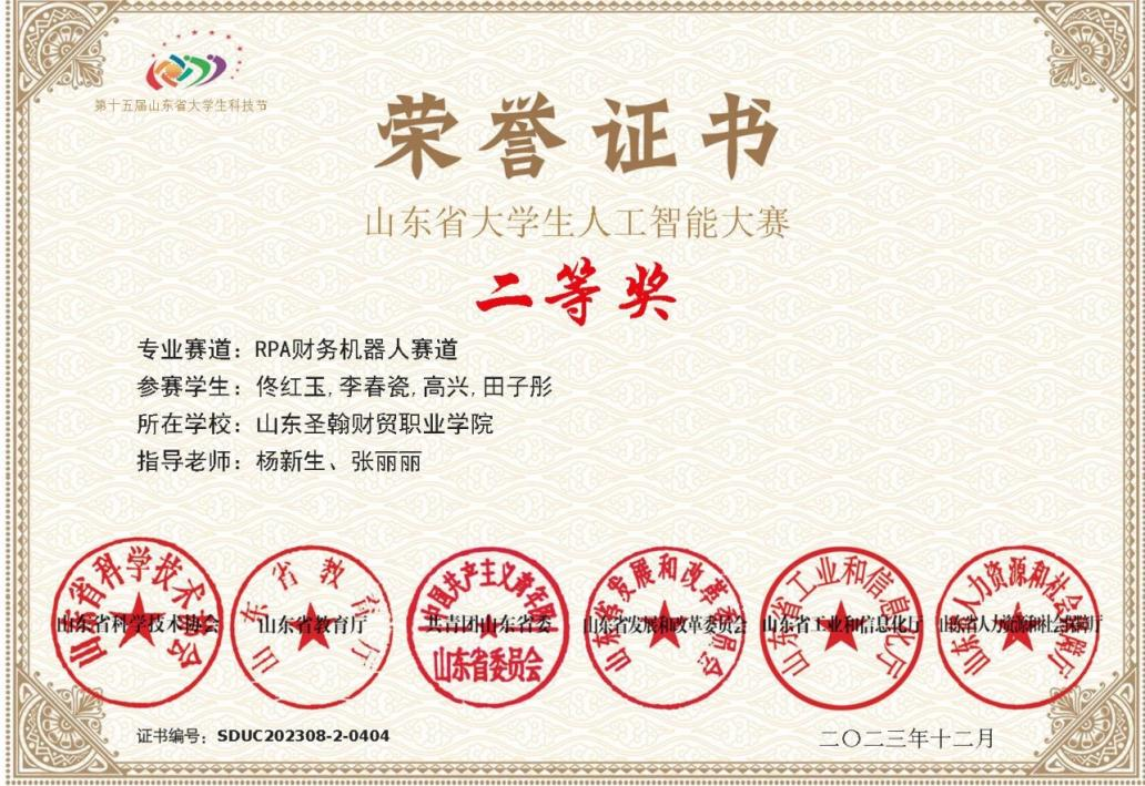 近日,第十五届山东省大学生科技节暨第六届山东省大学生人工智能大赛RPA财务机器人赛项(高职组)成绩揭晓,山东圣翰财贸职业学院商学院组织指导的4支参赛团队均获得二等奖的好成绩。