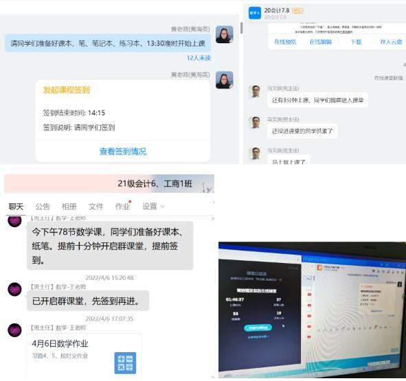 线上授课前,为了防止可能出现的突发疫情,根据学校工作安排,根据学生手机上现有的app,为了尽可能少的让学生下载安装app,结合线上授课需要,老师们选取了适合自己的教学平台,绝大多数老师选用的是钉钉直播,也有两位老师选择了qq群课堂,为例弥补qq群课堂的不足,再上课过程中讲qq群课堂与classin同时使用,提高了授课效率。