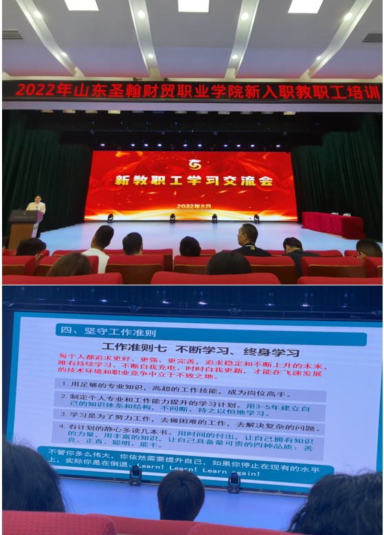 本次培训包含新教职工入职宣誓;校长讲话、校园实地参观;如何转换角色,迅速融入新环境;坚定政治方向 潜心教书育人;心理讲座;教学管理制度——《山东圣翰财贸职业学院教师手册》学习;教学基本文件——专业人才培养方案与课程标准学习;信息化手段在课堂教学中的应用;如何做好学生管理和教育;辅导员素质能力提升;大学生宿舍管理;高校共青团工作;谈高校辅导员的初步使命;职业院校课程教学中的课程思政;如何做一名合格的新时代职业院校专业课教师;如何做好职业教育教学改革研究项目立项申报工作;争做四有好老师,当好学生引路人。