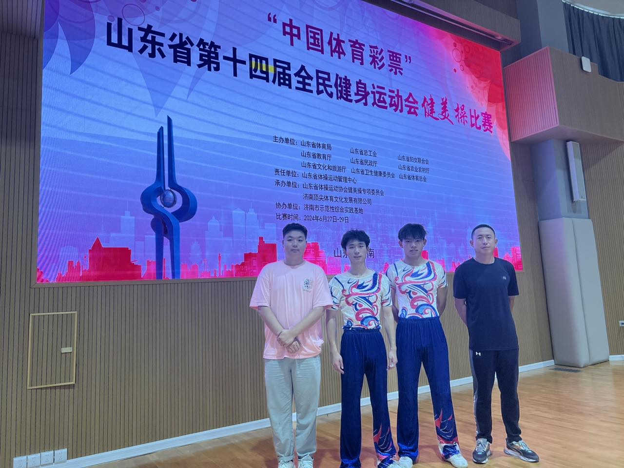 在2024年山东省第十四届全民健身运动会健美操比赛中,我校健美操代表队由公共基础部体育教研室主任辛彦斌担任领队,崔璟、刘自浩老师担任教练,带领5名运动员参加了3个项目的比赛,在比赛中我校斩获女子单人操第一名,男子单人操第二名、男子单人操第五名的好成绩,并荣获体育道德风尚奖。