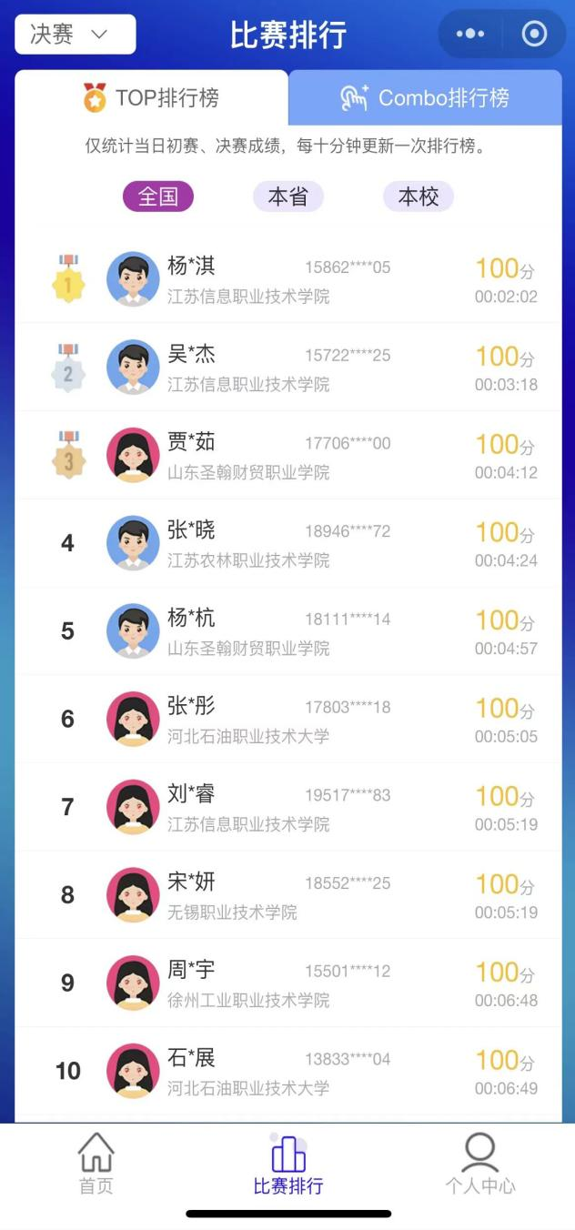 第八届“亿学杯”全国商务英语实践技能大赛词王赛道决赛于2024年6月6日晚上8点落下帷幕。在经历了6月3日-4日第一场及6月4日-5日第二场两场初赛后,我校共47名同学成功晋级全国100强。与来自于全国各地的选手进行角逐。最终,白彦彦老师指导的健康学院口腔医学技术1班的贾婉茹同学及口腔医学技术7班的杨苏杭同学成功晋级全国十强,分别取得全国第三及全国第五的好成绩。