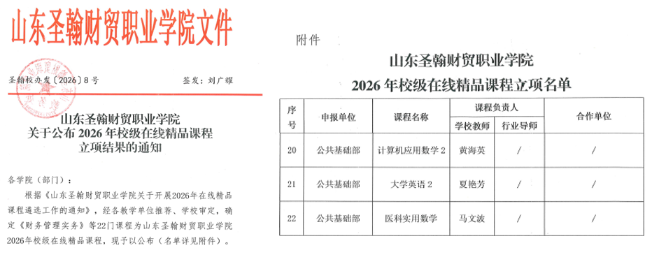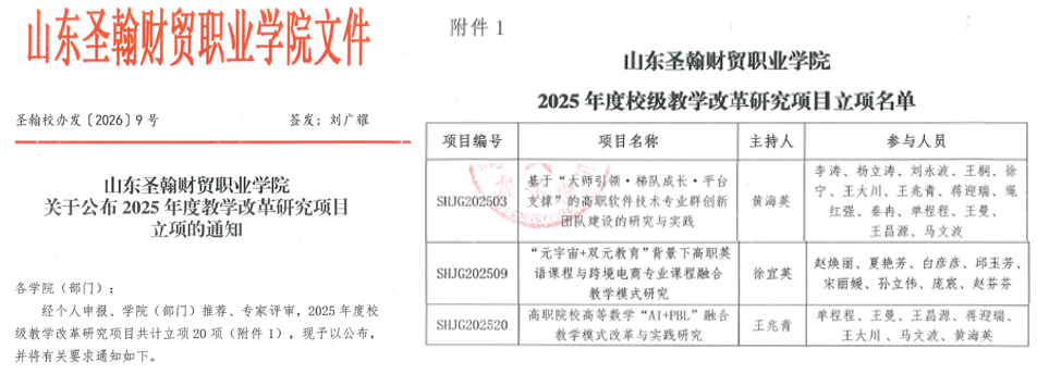 近日,山东圣翰财贸职业学院公共基础部在2025年度校级教学改革研究项目和2026年度校级在线精品课程立项中取得双项突破,共3项教改项目成功立项、3门课程获批校级在线精品课程,彰显了部门在课程建设、教学创新与教研融合方面的实力。