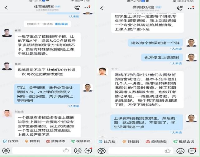 刘洋:上到一半电脑死机了,我先是给阎主任联系的,然后让李萍老师向教务处进行报备。后来电脑好了就没有调整课,但是感觉如果出现问题可以及时向部门领导反应,然后申请课程调整至晚自习时间。另外就是负责通知的尽量不要用一个人,他没看到消息容易集体错过上课时间。