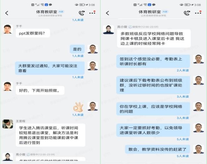 关于出勤率底的问题,我们通过讨论制定了一定的措施,对于出勤率底的情况,下课后可以把考勤表公布到学生群里,每节课都要公布,也可以让班干部通过群接龙的方式进行签到,统计出出勤情况,在群里公布,感觉效果还不错,学生出勤率得到了一定的提升。