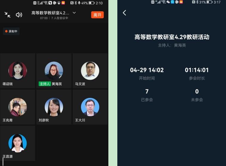线上教学阶段,虽然教学工作任务比较重,老师们要积极推进数学竞赛、在线开放课程建设、教师教学能力比赛等各项教学之外的工作。在接下来的工作中希望大家加倍努力,让各项工作推进的速度加快一些。对于出现的各种线上教学问题要及时沟通解决,保证学生的学习效果。