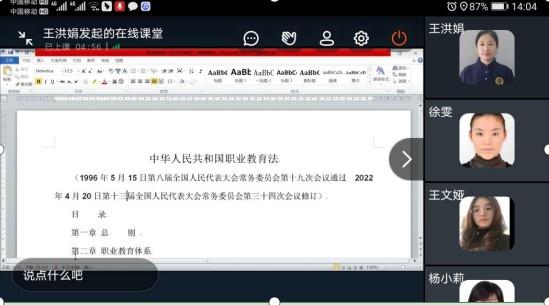 王洪娟老师发言:国家职业教育法时隔26年首次修订,修订后的新职业教育法共八章六十九条,2022年5月1日起施行。其中重点强调了:①明确职教与普教同等重要地位,职校生升学就业享有平等机会;②建立符合职业教育特点的考试招生制度;③不得设置条件妨碍职校生平等就业;④提高技术技能人才的社会地位和待遇……