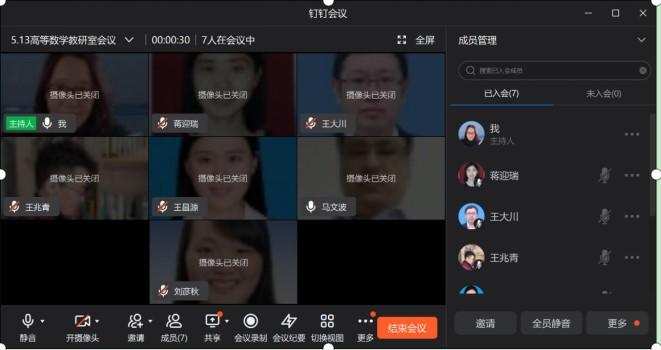 2022年5月13日下午,高等数学教研室全体教师在钉钉视频会议召开了教研会议,会议持续了近70分钟。本次教研活动主要是总结本周线上教学情况、继续推进在线开放课程和教学能力大赛、下周各门课的阶段性测试、赛事星题库进展情况等。主要内容如下: