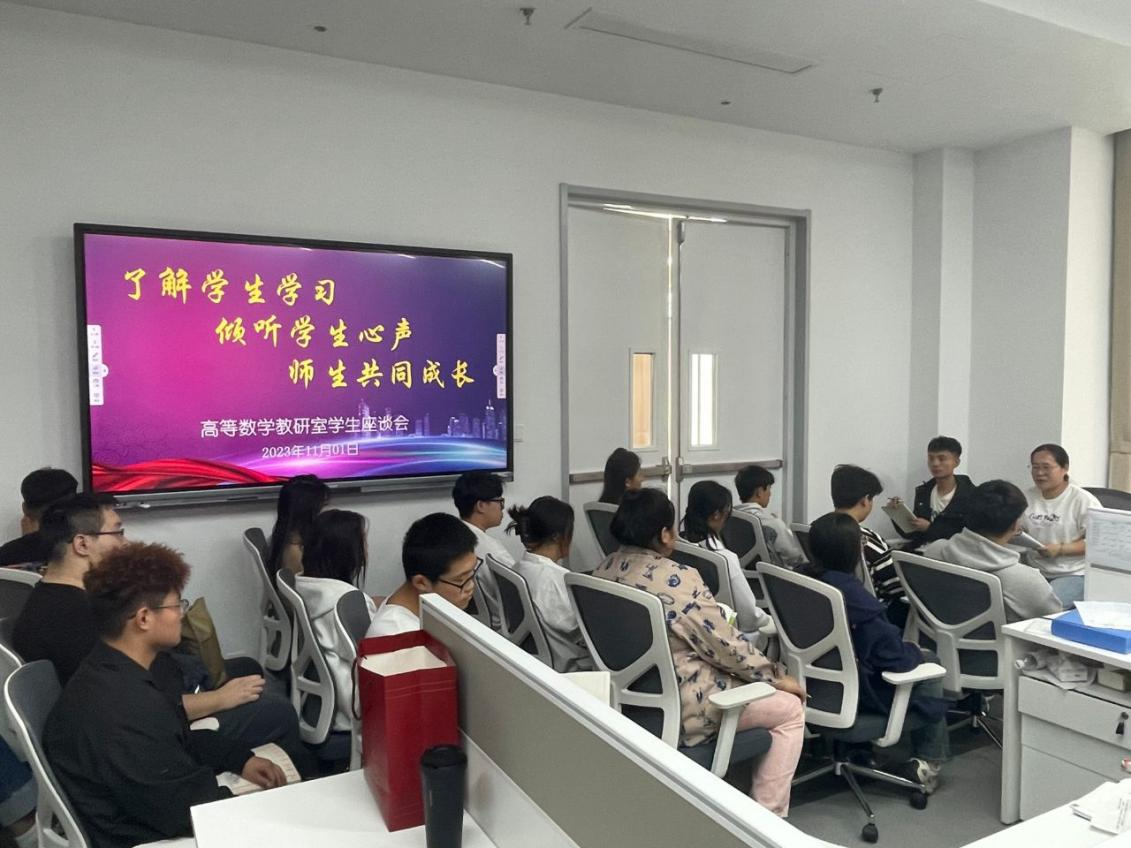 黄主任及教研室的老师们都认真倾听并进行了详细记录,针对部分问题进行了现场解答。黄主任表示,对学生们提出的意见与建议,教研室内部将进行梳理、研究,以便提高高等数学的学习效果。同时她倡导,不能单纯依靠老师的教,学生自身更要学会学习、 主动学习,增强自主学习能力。至此,座谈会圆满结束。总体来说,此次座谈会达到了预期目 的,为教师和学生构建了和谐的交流平台,并对推动高等数学教学的进一步规范化,端正教风与学风,提高教学质量和教学效果,起到了积极作 用。