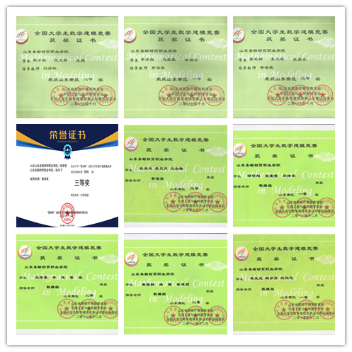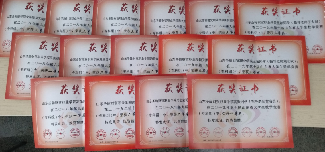 高等数学教研室秉承“以赛促学、以赛促教”的原则,积极组织学生参加山东省大学生数学竞赛(专科组)和全国大学生数学建模,获得数学竞赛省一等奖2项,省二等奖10项,省三等奖15项,获得数学建模竞赛省一等奖2项,省二等奖6项,省三等奖2项。通过比赛,培养了学生主动探索、勇于发现的科学精神,创新意识和创新精神,踏实细致、严谨科学的学习习惯,团结协作精神,以及提高学生的数学文化素养。