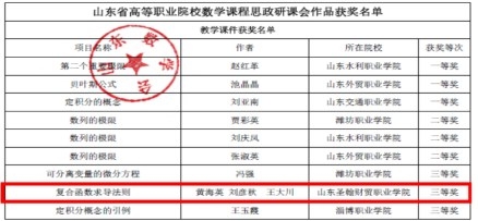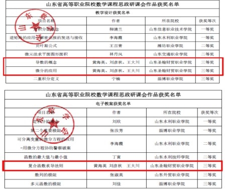近日,从山东数学会获悉,在山东数学会主办的山东省高职院校数学课程思政研课会中,山东圣翰财贸职业学院公共基础部高等数学教研室黄海英刘彦秋和王大川老师推送作品中,课程思政视角下的教学设计获得三等奖2项、课程思政视角下的电子教案获得三等奖1项、课程思政视角下的教学课件获得三等奖1项。