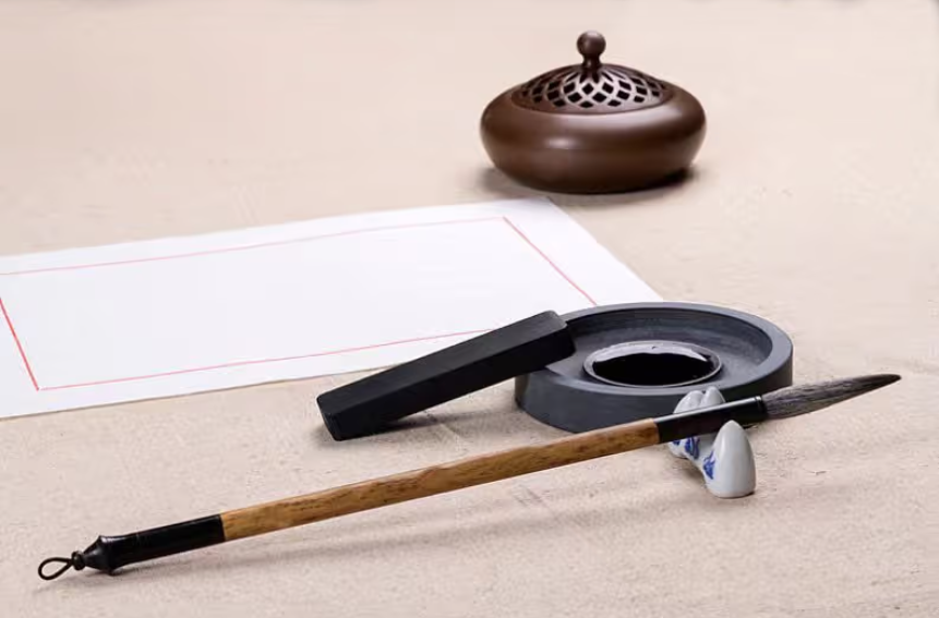文房四宝, the Four Treasures of Study, refer to the four writing tools:笔, writing brush,墨, inkstick,纸rice paper, and砚, inkslab.Using a writing brush (毛笔) differs from using a ballpoint pen (圆珠笔) or typing in that it requires a greater connection between the mind and the body and intimate interlocution between the calligrapher's heart and the world that he presents on paper. Calligraphers regard their works as reshaping the cosmic world. To achieve a state of harmony between nature and human beings, they sketch the rudiments in their mind's eye before they 挥毫泼墨, wield their brushes to write in ink.