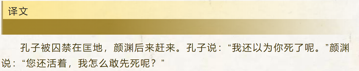 这是一则有趣的故事,孔子被困在匡地,处境艰难。过了很久,颜回才赶过来,孔子对颜回说:“我还以为你死了呢!”显然有点儿责怪,也有担心。颜回对老师说:“老师你还活着,我怎么敢死呢!”这几句简单的话,把老师对学生的信任、担心,以及学生对老师的热爱、忠诚表达的淋漓尽致。师徒二人,这种生死与共的感情,让人动容。最终学生颜回死在了老师孔子之前,孔子悲痛欲绝,许多人都认为老师悲痛过分了。