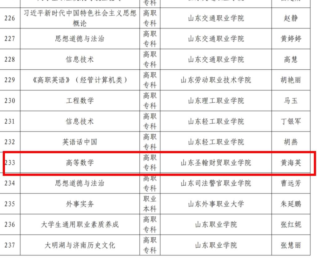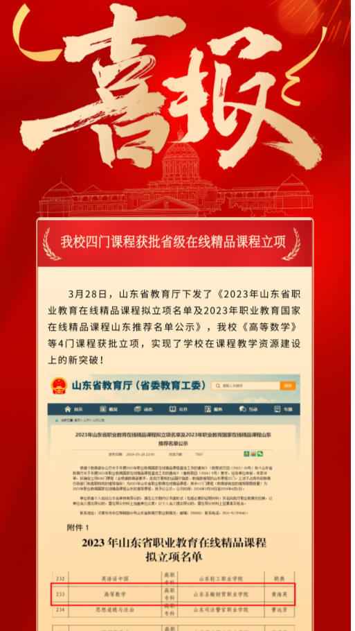根据教育部办公厅《关于开展2022年职业教育国家在线精品课程遴选工作的通知》和《省教育厅办公室关于开展2022年职业教育在线精品课程遴选工作的通知》要求,山东省教育厅公示了2023年省级职业教育在线精品课程立项名单,拟确定立项636门课程(含根据教育部要求,由山东省教育厅复核的全国行指委、教指委推荐的山东课程22门。上述不占用市级教育行政部门和高职院校的推荐指标)为2023年山东省职业教育在线精品课程,其中117门课程(教育部规定的推荐限额数量)为2023年职业教育国家在线精品课程山东拟推荐课程。我校公共基础部高等数学教研室在黄海英主任的带领下,《高等数学》课程获省级在线精品课程立项。