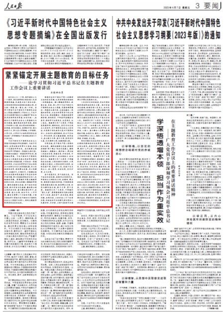 4月3日,学习贯彻习近平新时代中国特色社会主义思想主题教育工作会议在北京召开,习近平总书记出席会议并发表重要讲话。习近平总书记从新时代新征程党和国家事业发展全局的战略高度,深刻阐述开展主题教育的重大意义和目标要求,对主题教育各项工作作出全面部署。习近平总书记的重要讲话高屋建瓴、视野宏阔、思想深邃、内涵丰富,具有很强的政治性、思想性、指导性,为全党开展主题教育提供了根本遵循,是一篇马克思主义纲领性文献。