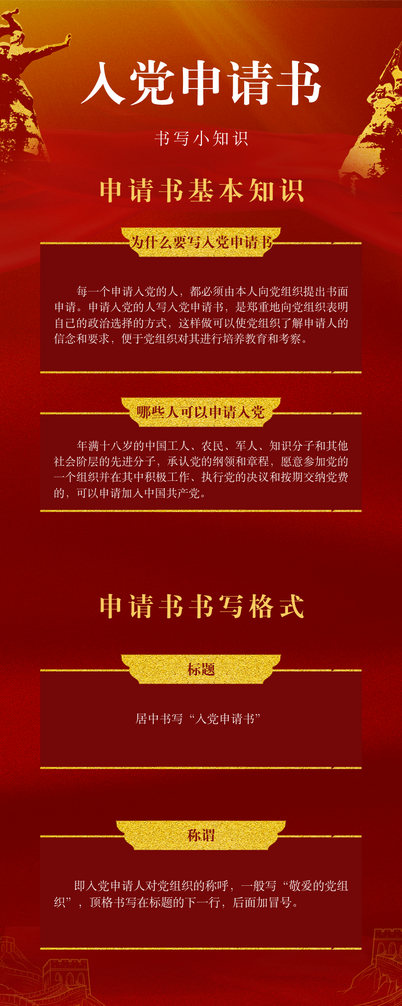 3.要认真学习党章和有关党的基本知识,真正了解党,认识党,通过对党的全面了解,郑重地作出自己的政治选择,树立正确的入党动机。在此基础上,要联系思想实际谈自己对党的认识,向党组织交心,切忌只抄书,切忌在网上抄袭他人申请书,不谈不真实思想。