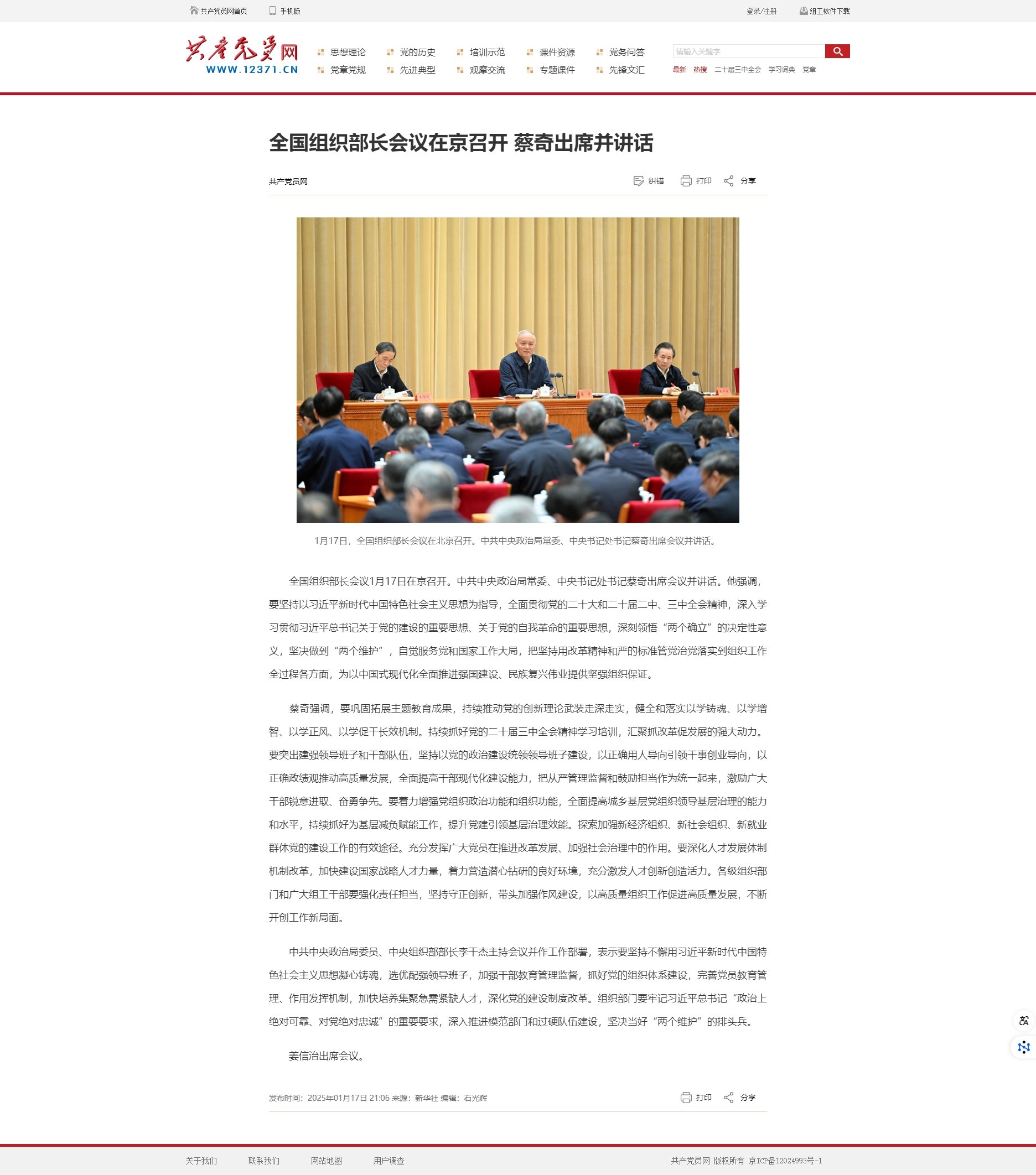 全国组织部长会议在京召开 蔡奇出席并讲话