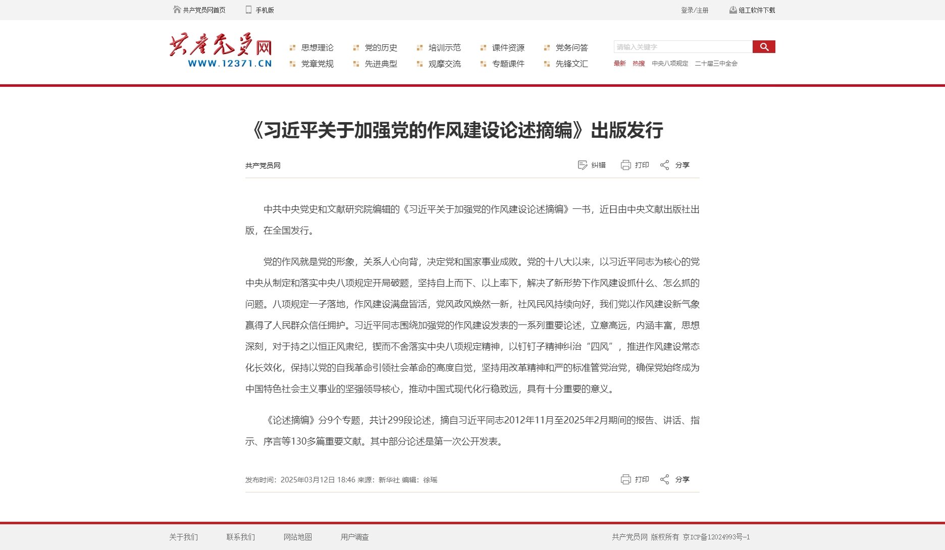 《习近平关于加强党的作风建设论述摘编》出版发行