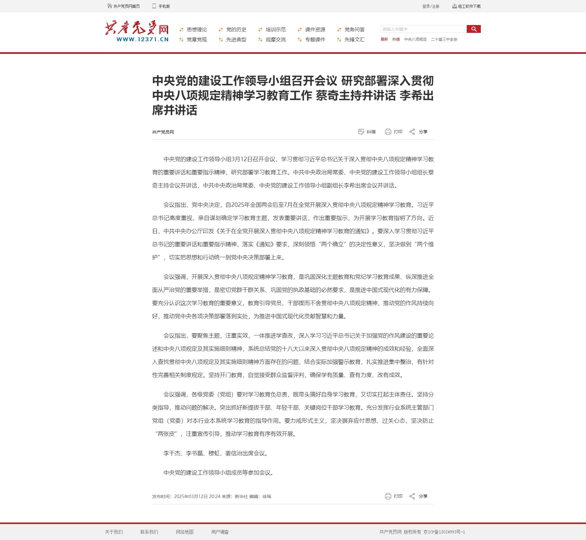 中央党的建设工作领导小组召开会议 研究部署深入贯彻中央八项规定精神学习教育工作