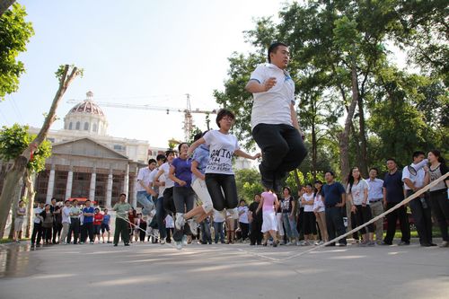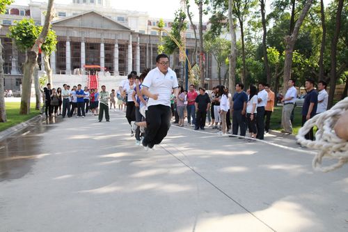 所谓“八人跳大绳”即是每队限定八人,时限两分钟、八人同时起跳,在规定时间内跳最多者为胜。由于各部门在赛前利用业余时间已经进行了充分的配合性训练,因此比赛刚开始各队老师们便个个摩拳擦掌、蓄势待发。虽然时间只有短短的两分钟,但这充分考验了队员们的齐心协力、配合默契程度,比赛的过程异常激烈、格外精彩。每支队伍都不甘落后,场上队员们整齐的口号声、观众们的加油呐喊声阵阵回荡在校园里,现场气氛振奋人心。