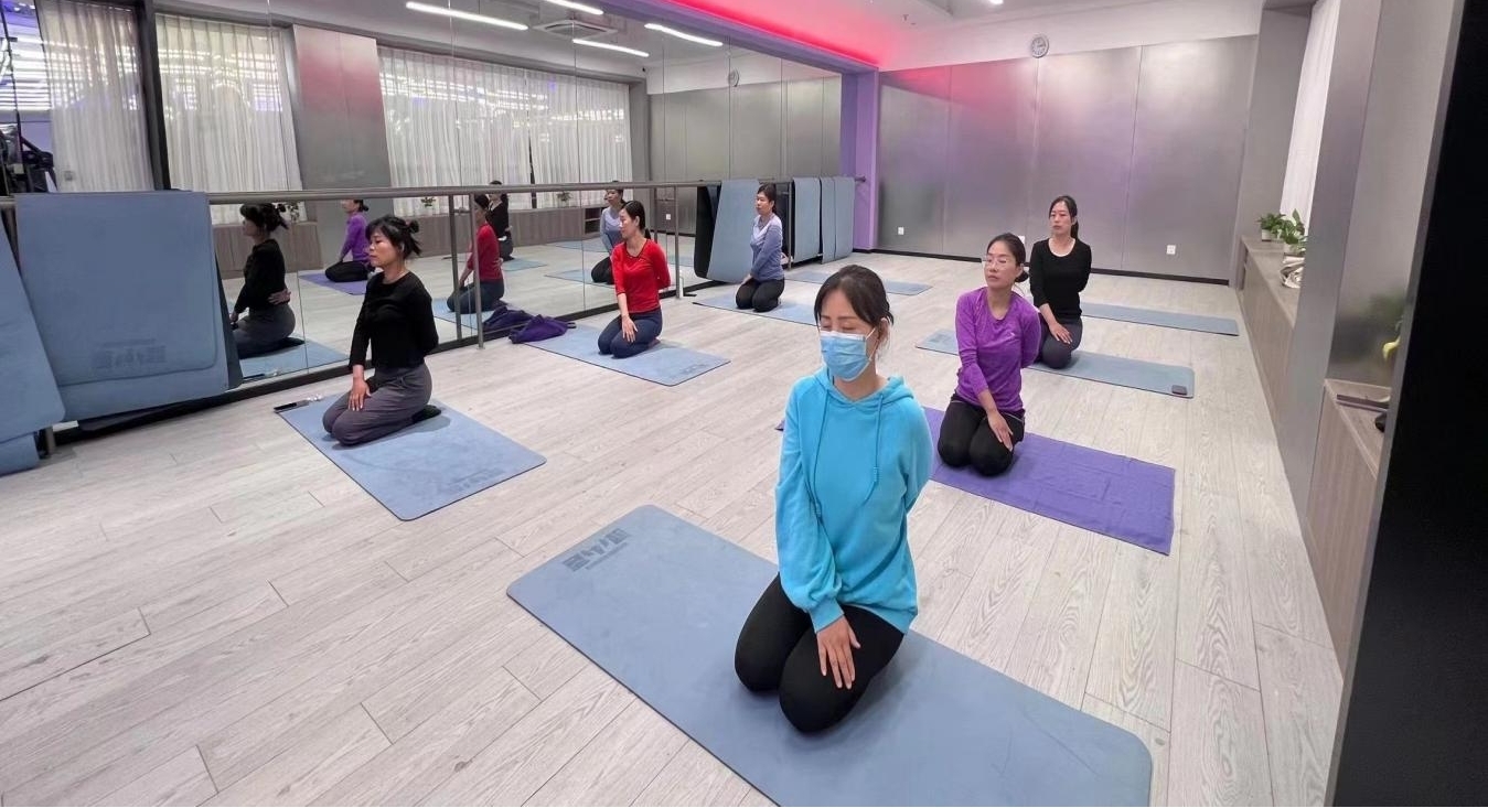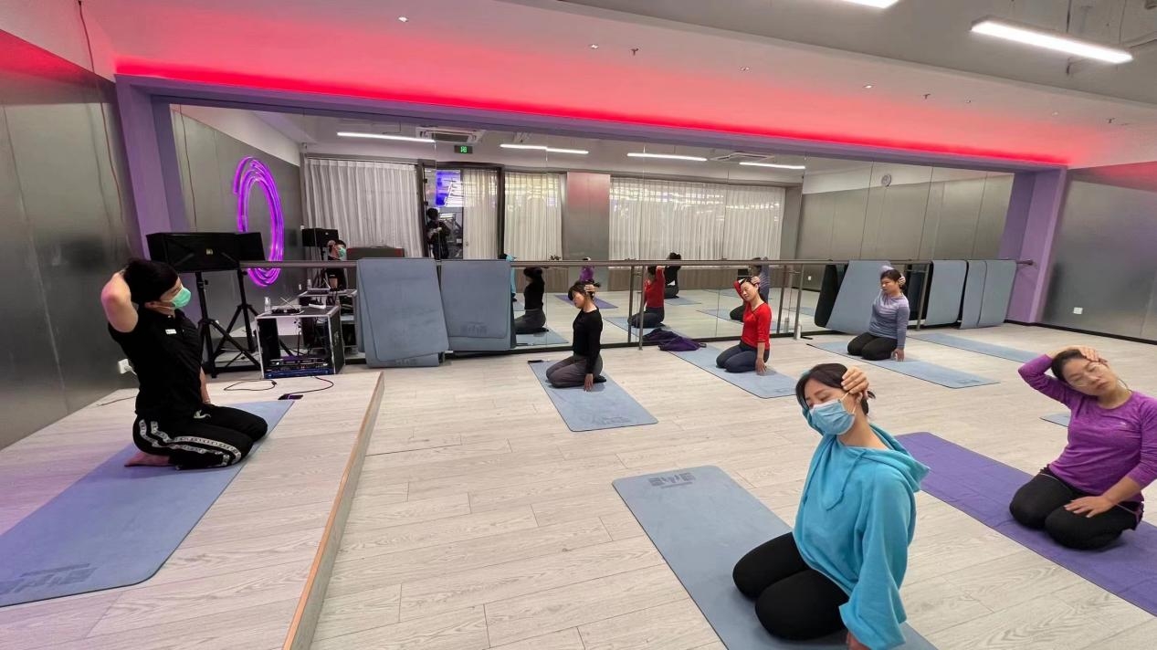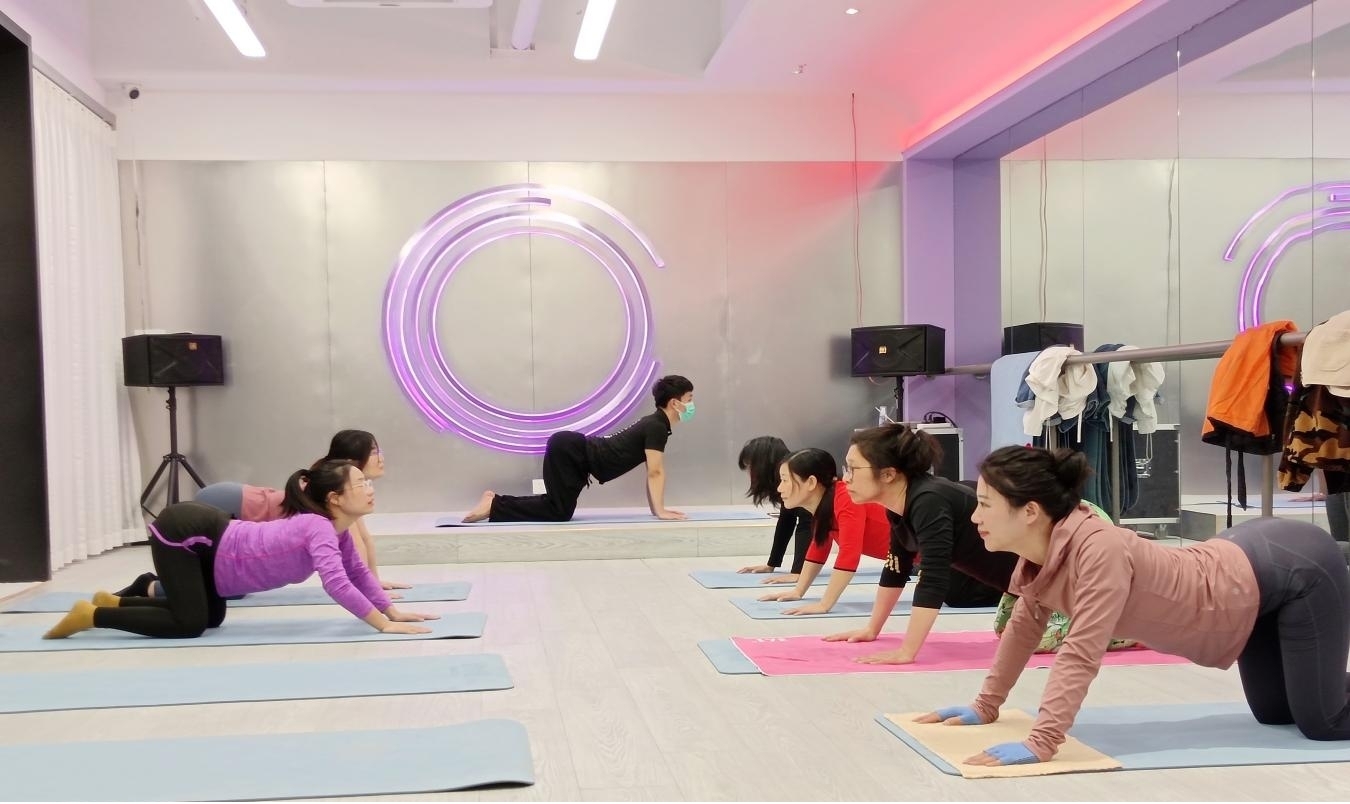 伴随着舒缓的音乐,老师们在教练的指导下,进行基础的拉伸训练。