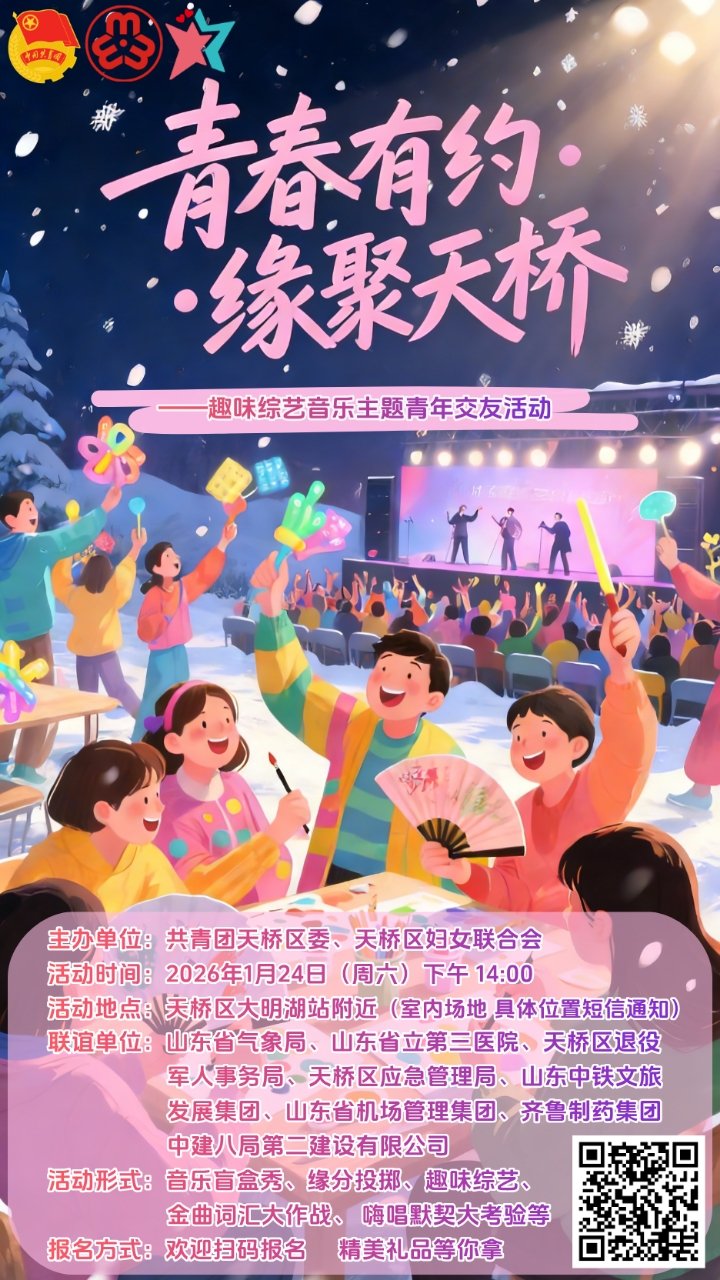 为拓宽青年教职工的交友渠道,搭建轻松有趣的交流平台,丰富大家的业余生活,现组织参加由共青团天桥区委、天桥区妇女联合会主办的 “青春有约・缘聚天桥” 趣味综艺音乐主题青年交友活动,具体安排如下:
