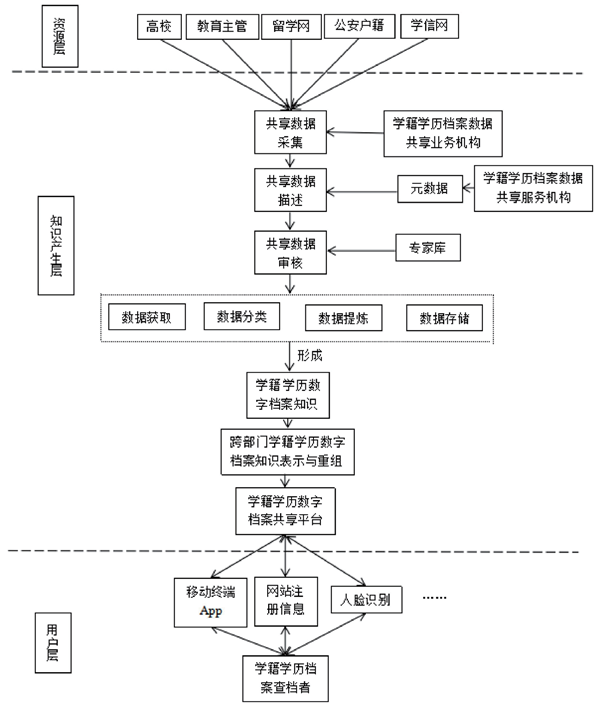 学籍学历学位档案数字共享路径可分为三层,即数字档案资源层、数字档案知识产生层和用户获取数字档案层,如图所示。