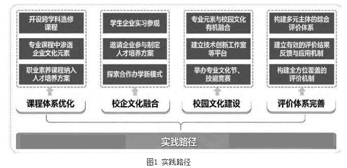 为推动高职院校多元协同文化育人实践走深走实,需从课程体系、校企融合、校园文化、评价机制四个关键维度协同发力,构建全方位、多层次的育人体系(见图1)。